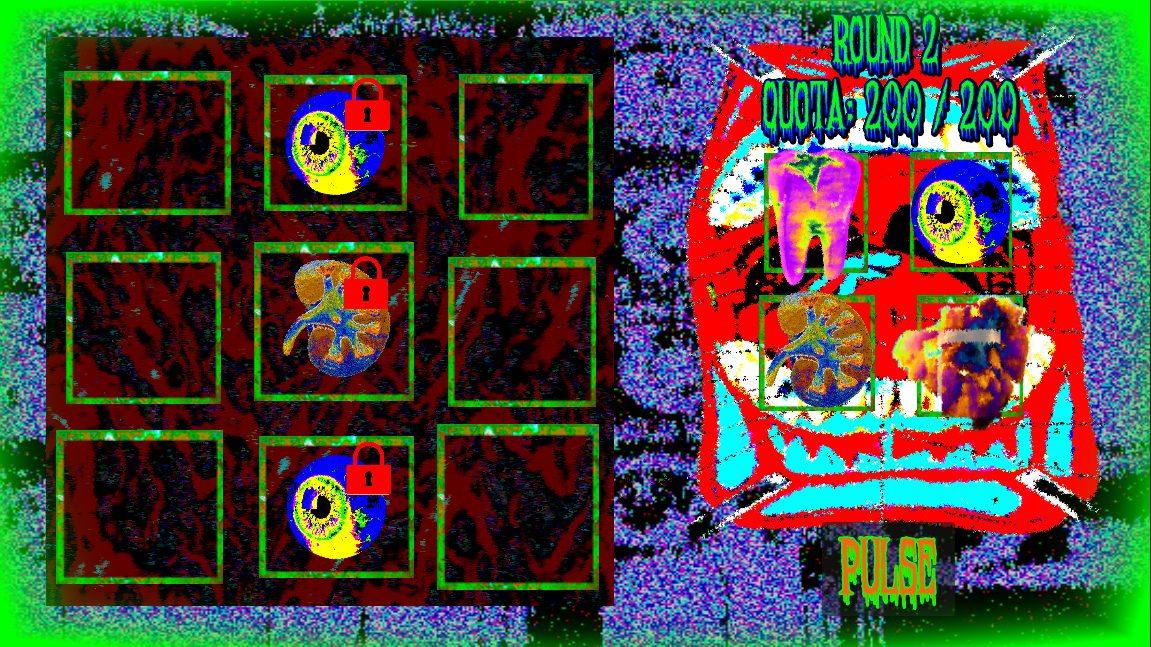 Click on frames to move parts between them. Hold alt to view interactions between parts and arrange them so that they generate enough points for you to move to the next round. Press the Pulse button when ready to trigger your parts.
